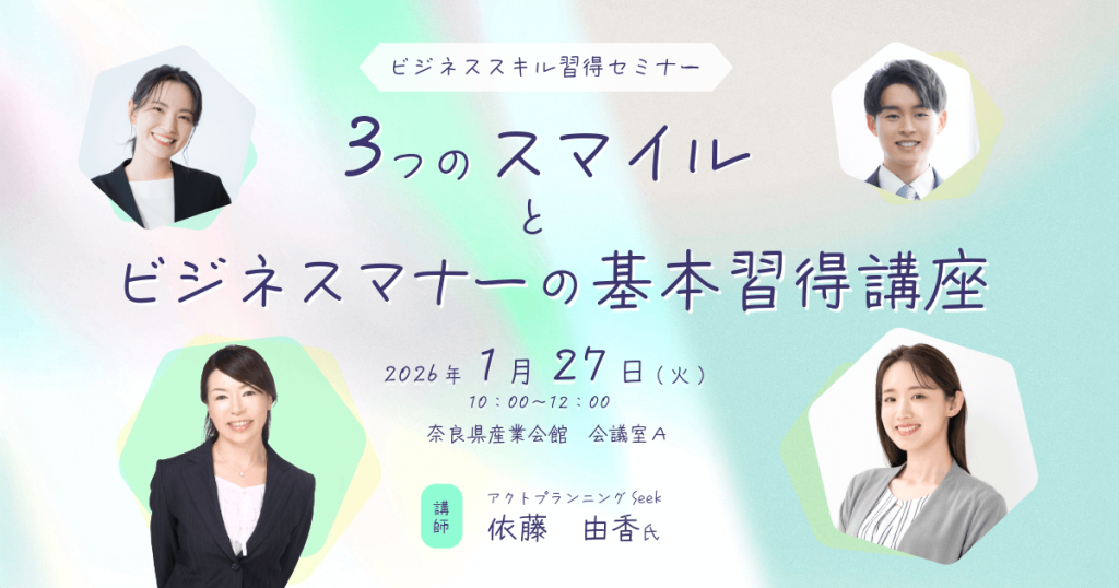 2026年1月27日(火)奈良県産業会館にて開催!基本的なビジネスマナー、身についていますか。学びなおしするなら今がチャンス! 受講ポイント・就職活動の実績として認められます(会場参加の方のみ受講証明を発行します)・求職中・在職中・学生も受講でき... -