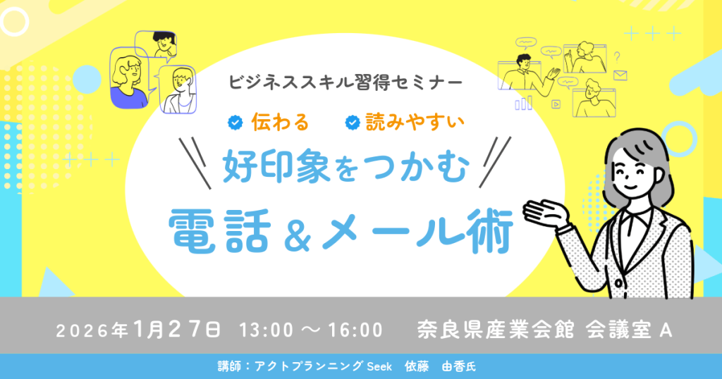 2026年1月27日(火)奈良県産業会館にて開催!電話応対からメールの書き方まで基本をマスター。自信に満ちたジブンで働こう! 受講ポイント・就職活動の実績として認められます(会場参加の方のみ受講証明を発行します)・求職中・在職中・学生も受講できま... -